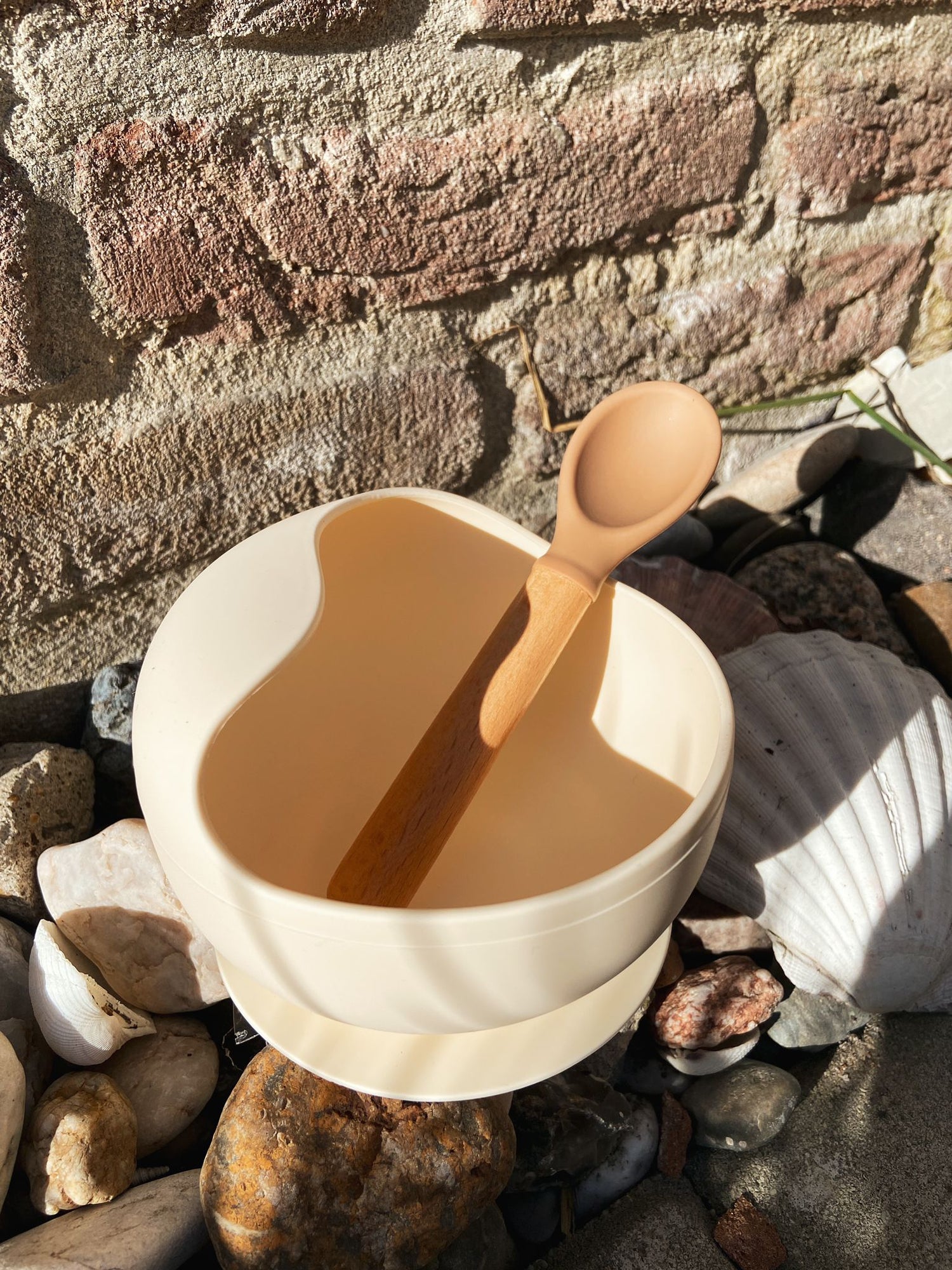 De baby kom en lepels zijn verkrijgbaar in 2 kleuren: crème en bruin. Leuk om te combineren.